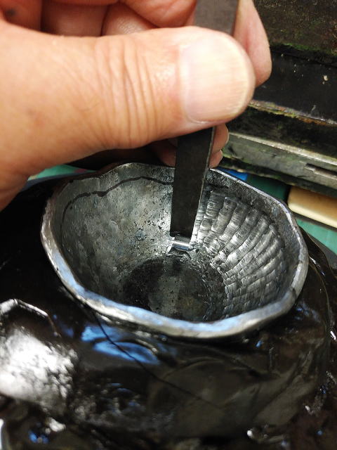 銅にSVを打ち込み象嵌し内側に錫板を小さめに作り中空として熱さ対策としました。