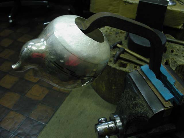 金属板や棒などを金槌で「打ち延べ」「打ち絞り」の手作業の工芸品と、大きな機械や、溶接技法で作られているものが周囲に溢れています。